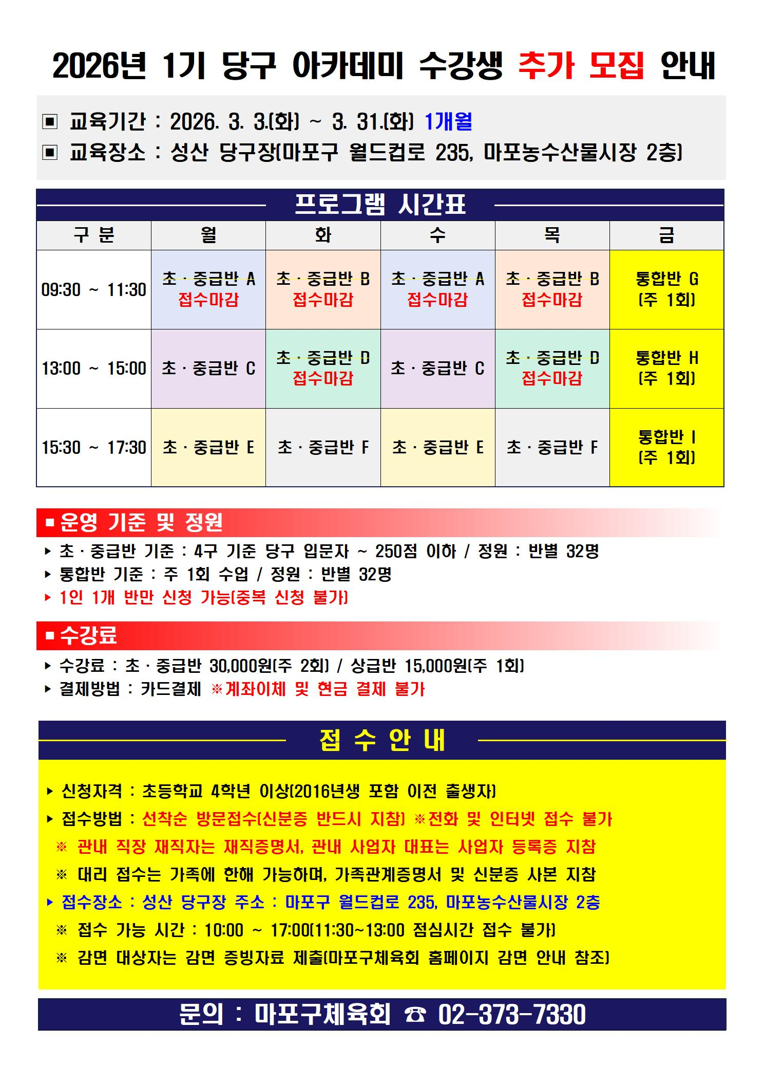 2026 성산당구장 아카데미 1기 수강생 추가 모집안내
