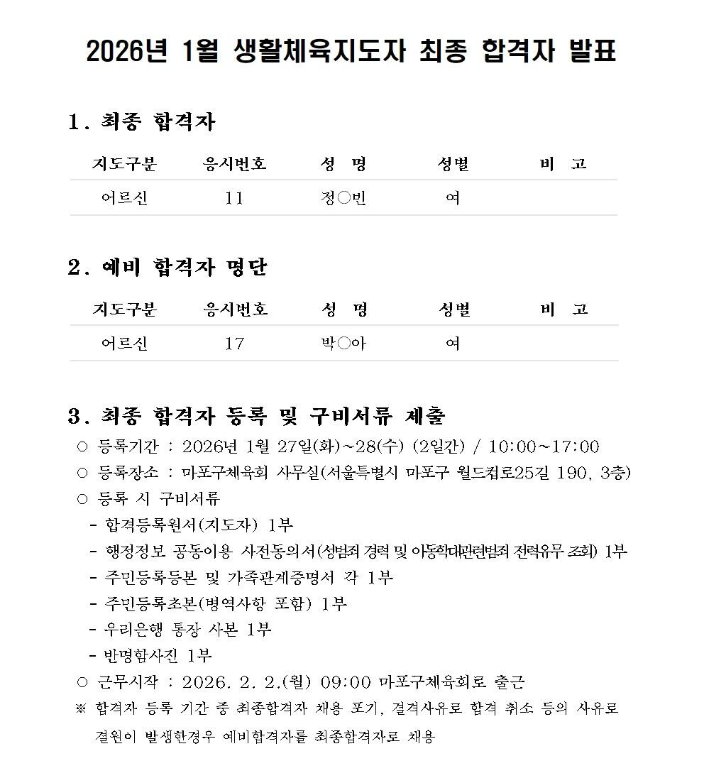 2026년도 1월 생활체육지도자 최종 합격자 발표