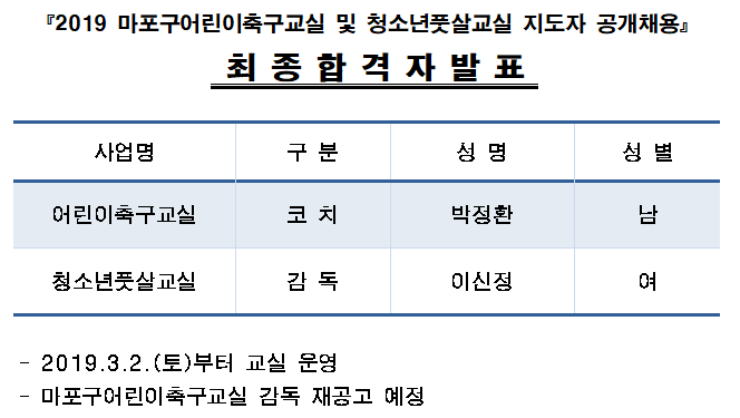 2019 마포구어린이축구교실 및 청소년풋살교실 지도자 최종합격자 발표