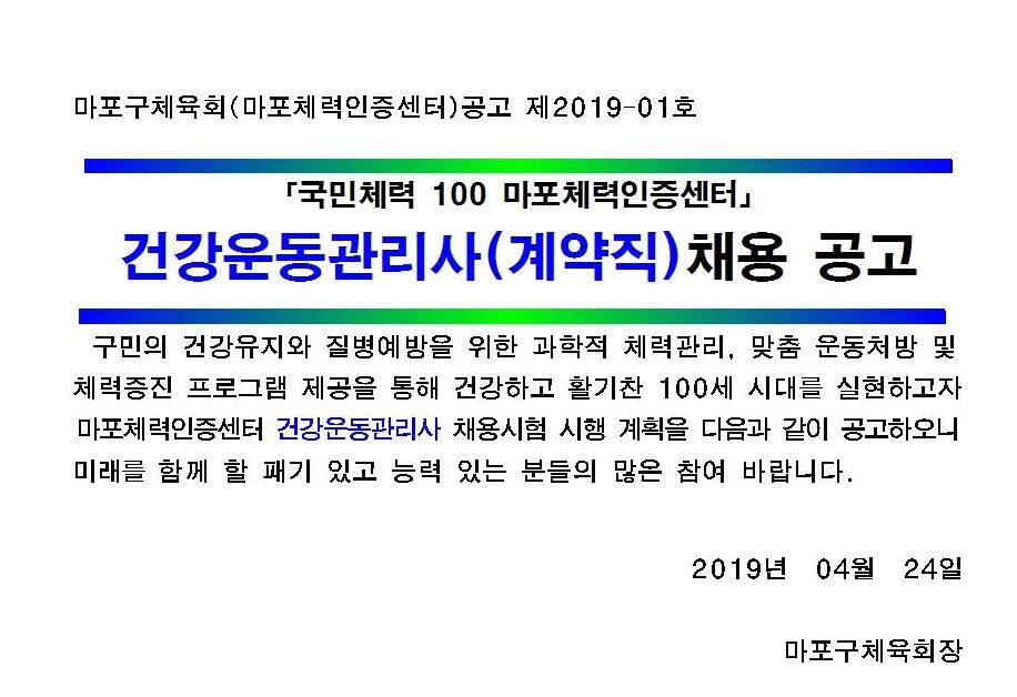 [마포구체력인증센터] 2019 건강관리사(계약직) 채용 공고