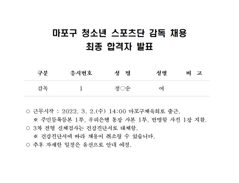 마포구 청소년 스포츠단 감독 채용 최종 합격자 발표