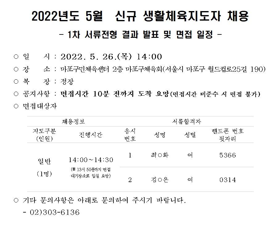 2022년도 5월 신규 생활체육지도자 채용 1차 서류전형 결과 및 면접 일정