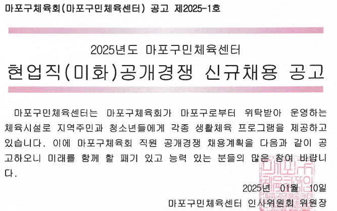 [마포구민체육센터 채용] 2025년 현업직(안내) 공개경쟁 신규채용 공고