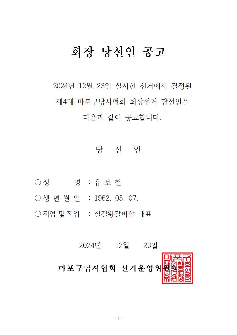 제4대 마포구낚시협회 회장 당선인 공고