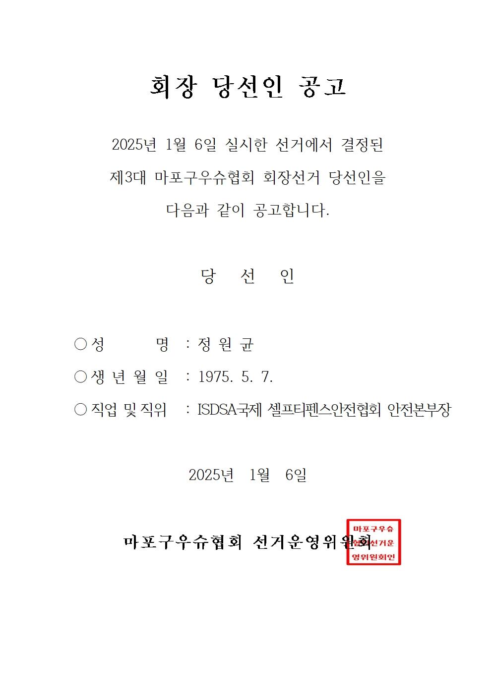 제3대 마포구우슈협회 회장 당선인 공고